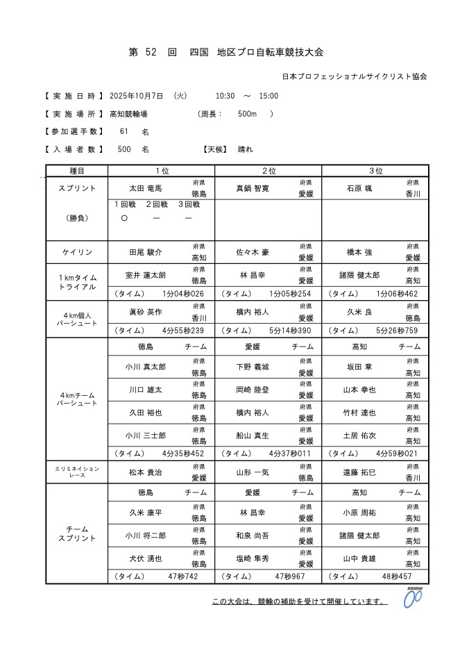 第52回四国地区プロ選手権自転車競技大会の実施結果について 2025.10.07 10月7日、四国地区プロ選手権自転車競技大会が高知競輪場において開催されましたので、実施結果を報告いたします。第52回四国地区プロ選手権自転車競技大会の実施結果