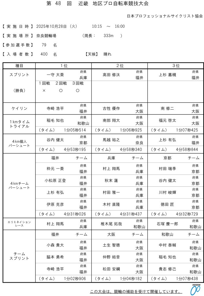 第48回近畿地区プロ選手権自転車競技大会の実施結果について 2025.10.28 10月28日、近畿地区プロ選手権自転車競技大会が奈良競輪場において開催されましたので、実施結果を報告いたします。 第48回近畿地区プロ選手権自転車競技大会の実施結果