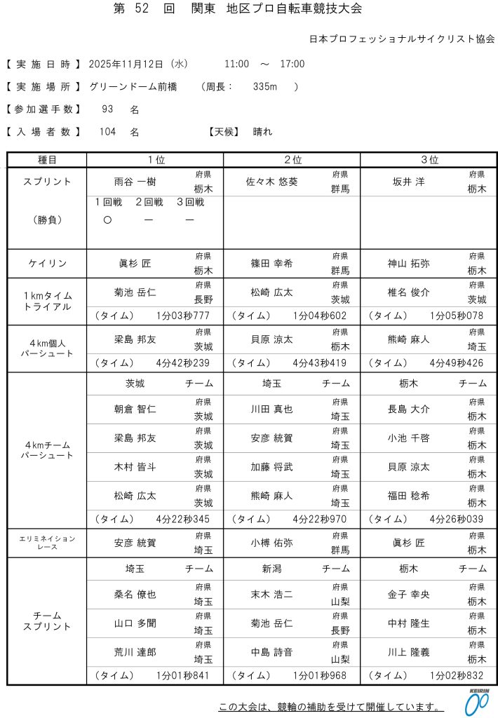 第52回関東地区プロ選手権自転車競技大会の実施結果について